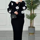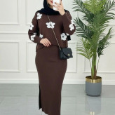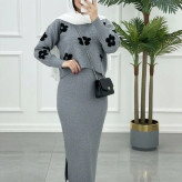 بلوز و سارفون بافت اکرلیک در رنگ بندی خاکی، طوسی و سرمهای. قد جلو بلوز ۵۰ سانتیمتر، قد پشت بلوز ۵۷ سانتیمتر و دور سینه ۱۱۲ سانتیمتر. قد آستین از یقه ۵۸ سانتیمتر و قد سارافون ۱۲۰ سانتیمتر.