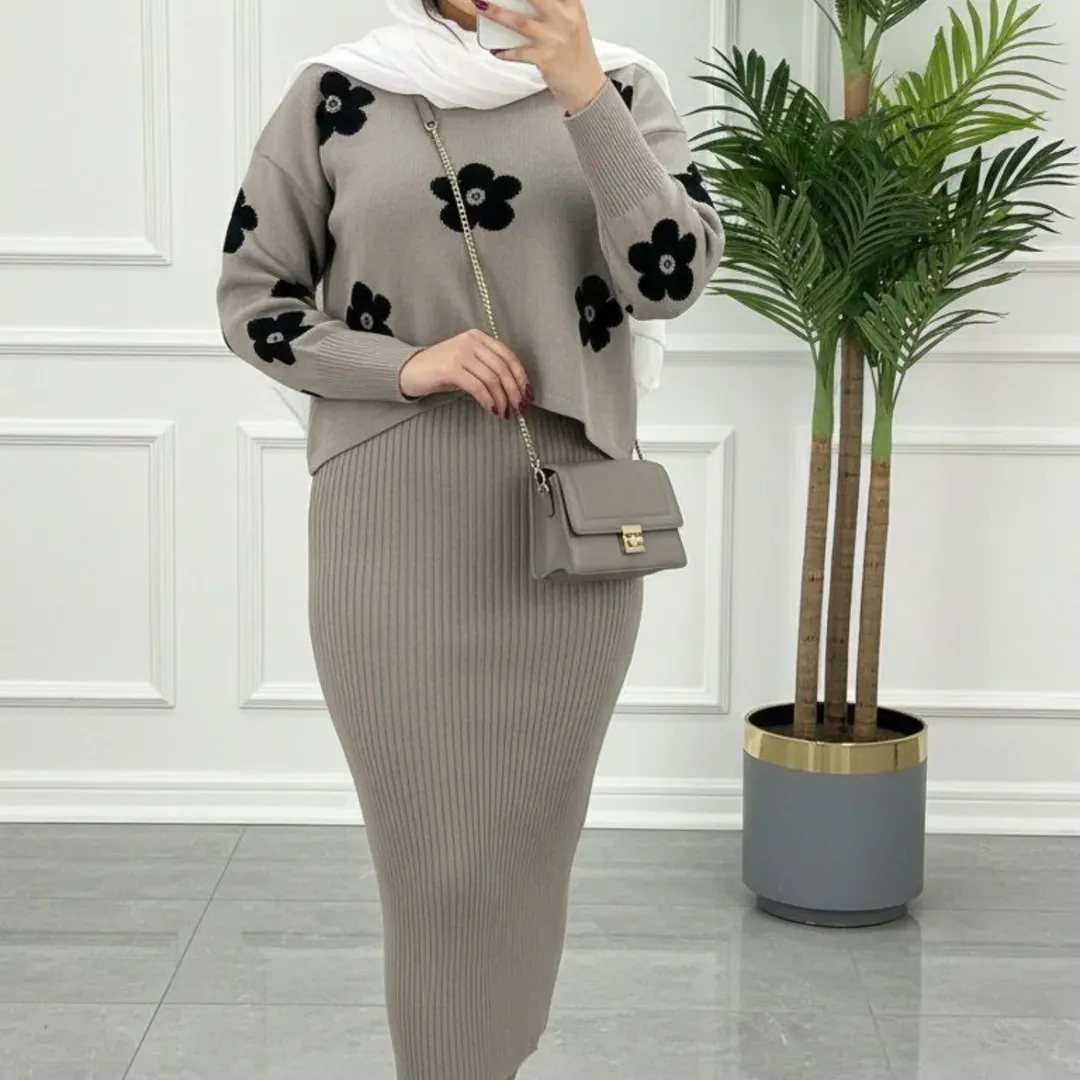 بلوز و سارفون بافت اکرلیک در رنگ بندی خاکی، طوسی و سرمهای. قد جلو بلوز ۵۰ سانتیمتر، قد پشت بلوز ۵۷ سانتیمتر و دور سینه ۱۱۲ سانتیمتر. قد آستین از یقه ۵۸ سانتیمتر و قد سارافون ۱۲۰ سانتیمتر.