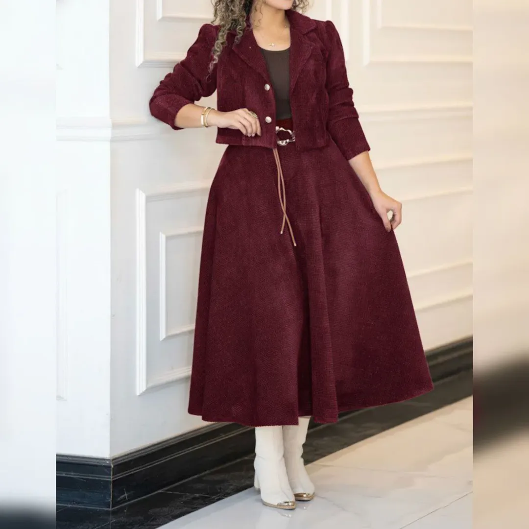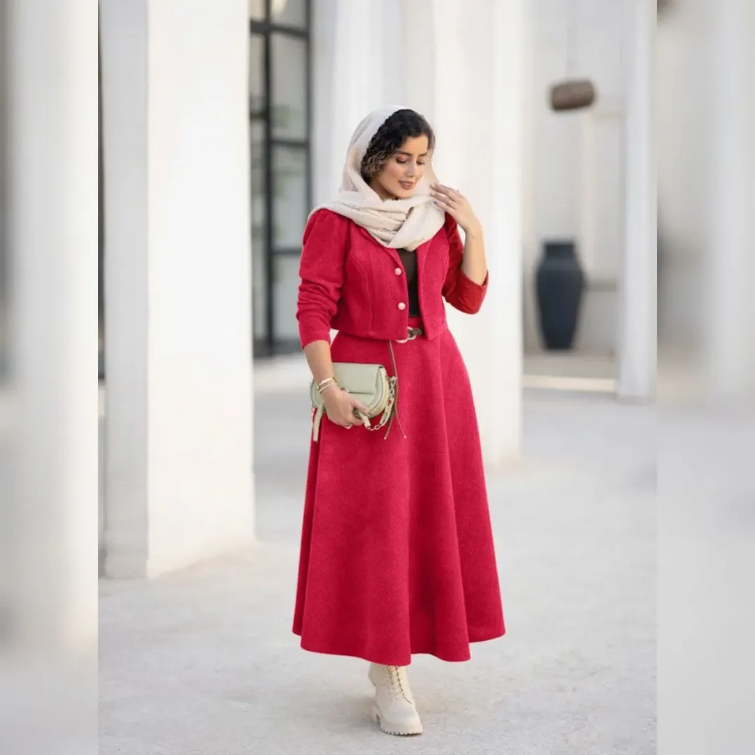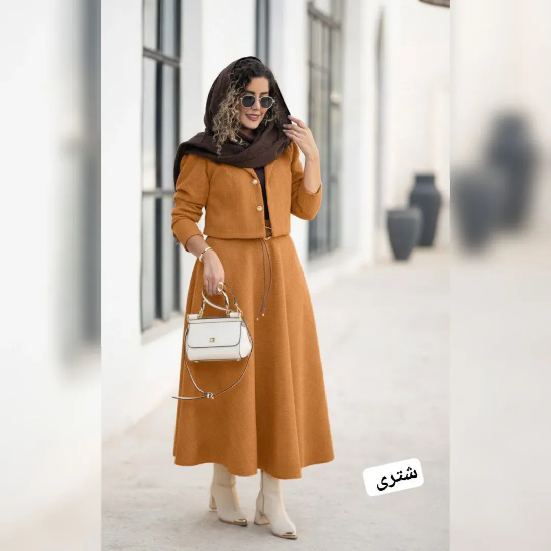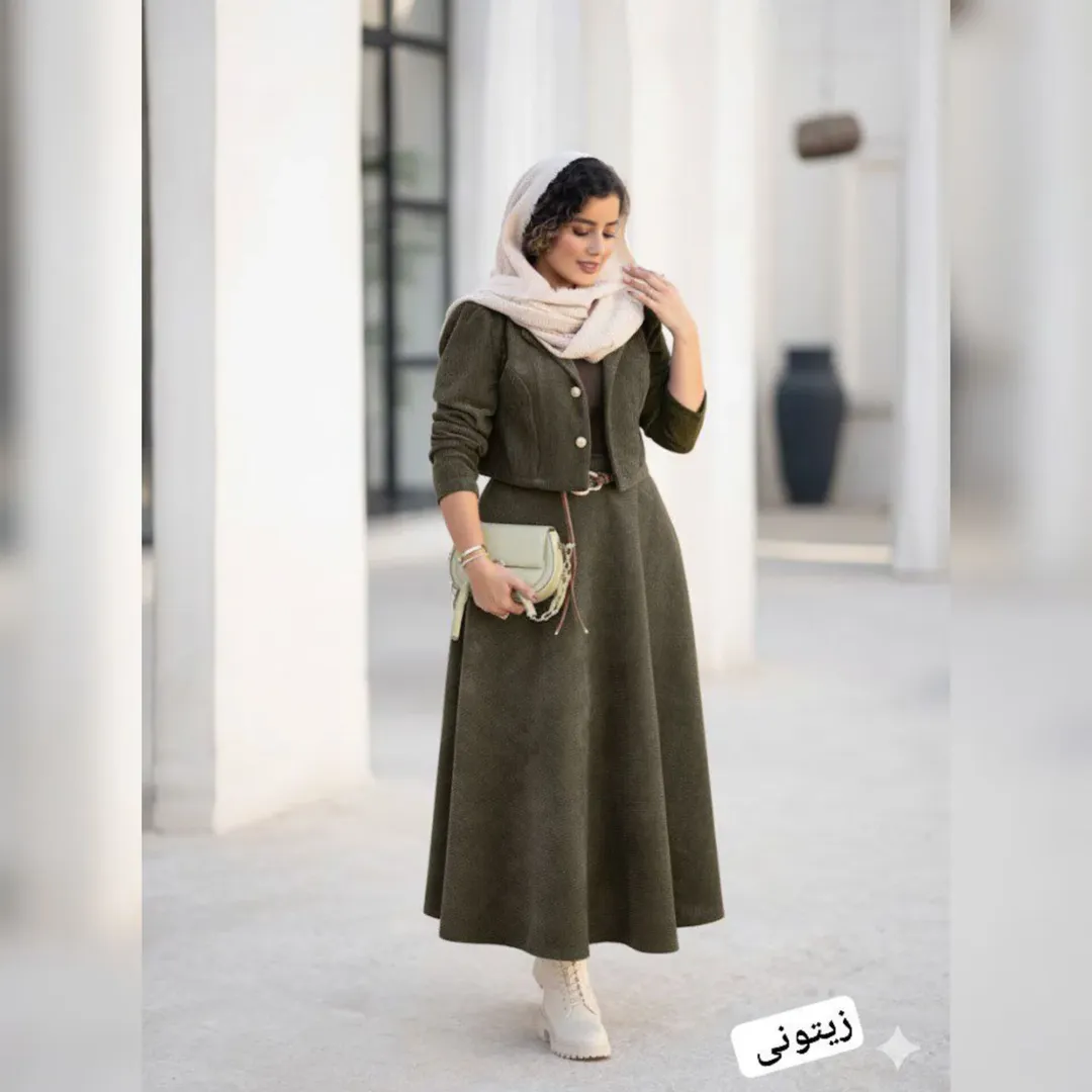 کت دامن همتا با جنس مخمل کبریتی ریز و رنگ بندی قرمز, زرشکی, مشکی, سورمه ای, سبز, طوسی, شتری و زیتونی. قد دامن ۹۰ و قد کت ۴۸، دور سینه ۱۱۰. جلو کت لایه کوبی شده.